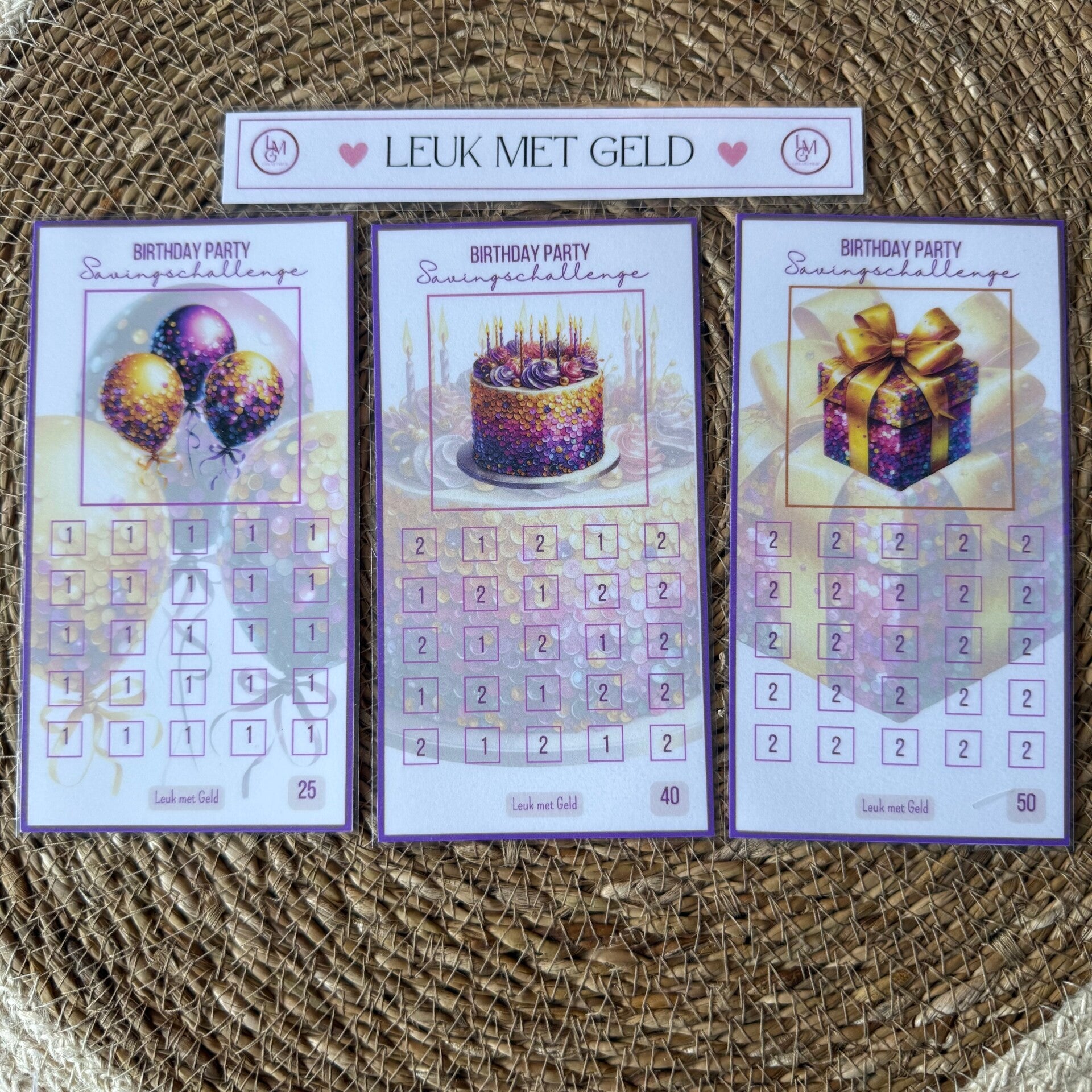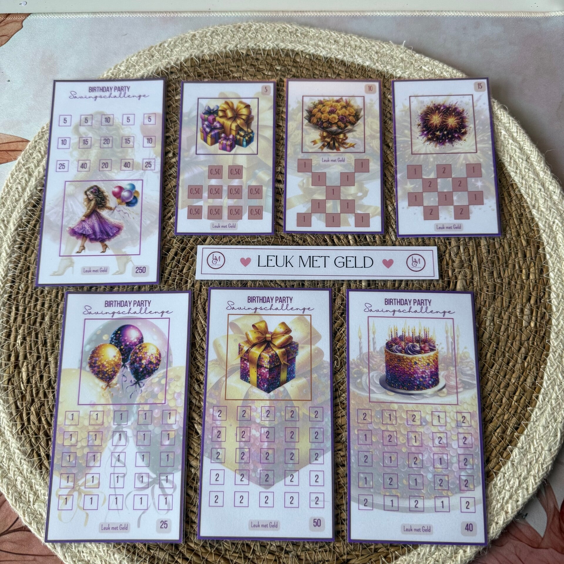 Deze kleurrijke Birthday Party Savingschallenge bestaat uit 3x A6 savingschallenge en 3x A7 savingschallenge. Ook zit er een dashboard bij waarbij de bedragen totaal €250 euro zijn.