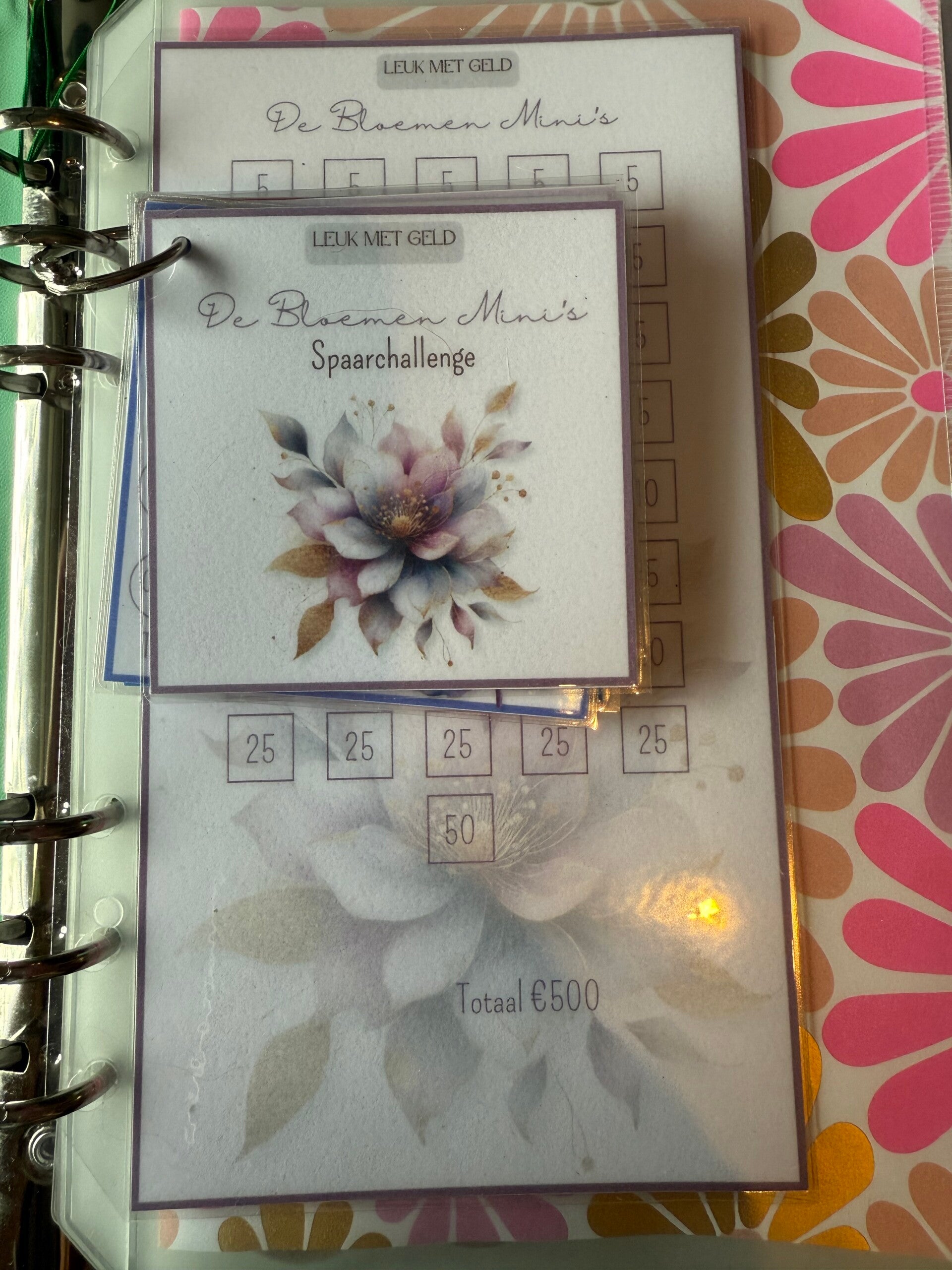 Deze kleurrijke Bloemen Mini's Spaarschallenge bestaat uit een A6-dashboard en 6 kleine spaarchallenges met als totaal spaarbedrag €500.